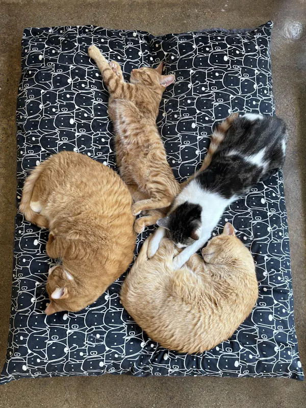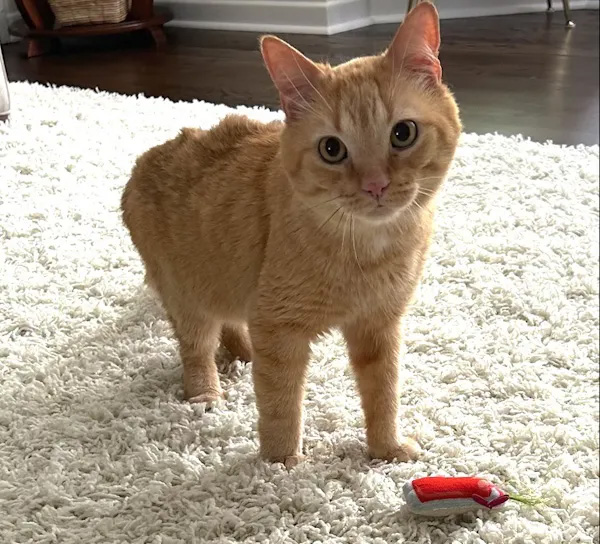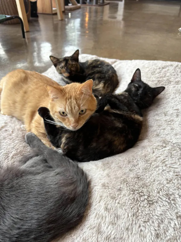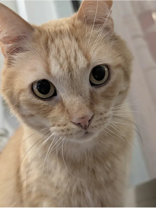 In 2023, just months after opening our new shelter on Livernois, Ferndale Cat Shelter removed 53 cats and kittens from a home. The cats were triaged at the shelter and we quickly worked to find foster homes and schedule spay and neuter appointments. Many of the adult cats remained at the shelter in our cat room. Chango was one of these cats. A quiet and gentle ginger boy with a vacant expression, Chango was the glue that bound these cats together. Soon to be known as “the cuddle puddle,” the cats we pulled from this home were accustomed to living on top of each other, having very little room to stretch and play and roam. Chango was always in the middle of the cat pile and could often be seen grooming his bff Stewart or shy Carley. Chango would always be the first to greet a new-comer with headbutts and sniffs. He wasn’t easy to handle, making medication or nail trims difficult, but he was never aggressive. He never hissed or swatted humans or other cats. He was a chill presence, like a cat buddha, welcoming all who visited and volunteered at the shelter.